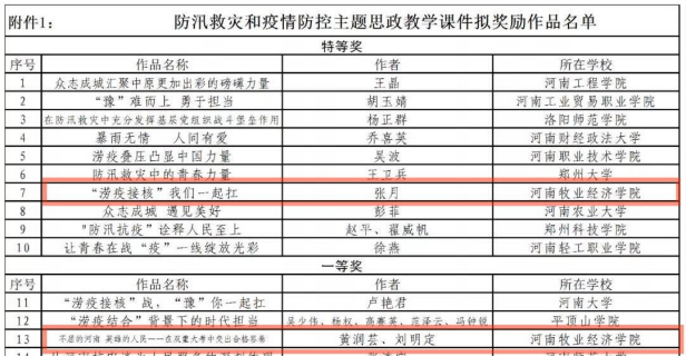 近日,河南省教育厅官网发布《关于防汛救灾和疫情防控主题思政教学课件、教学视频评审结果的公示》,bwin必赢教师分别取得教学课件特等奖1名、一等奖2名,教学视频一等奖1名、三等奖1名的好成绩。